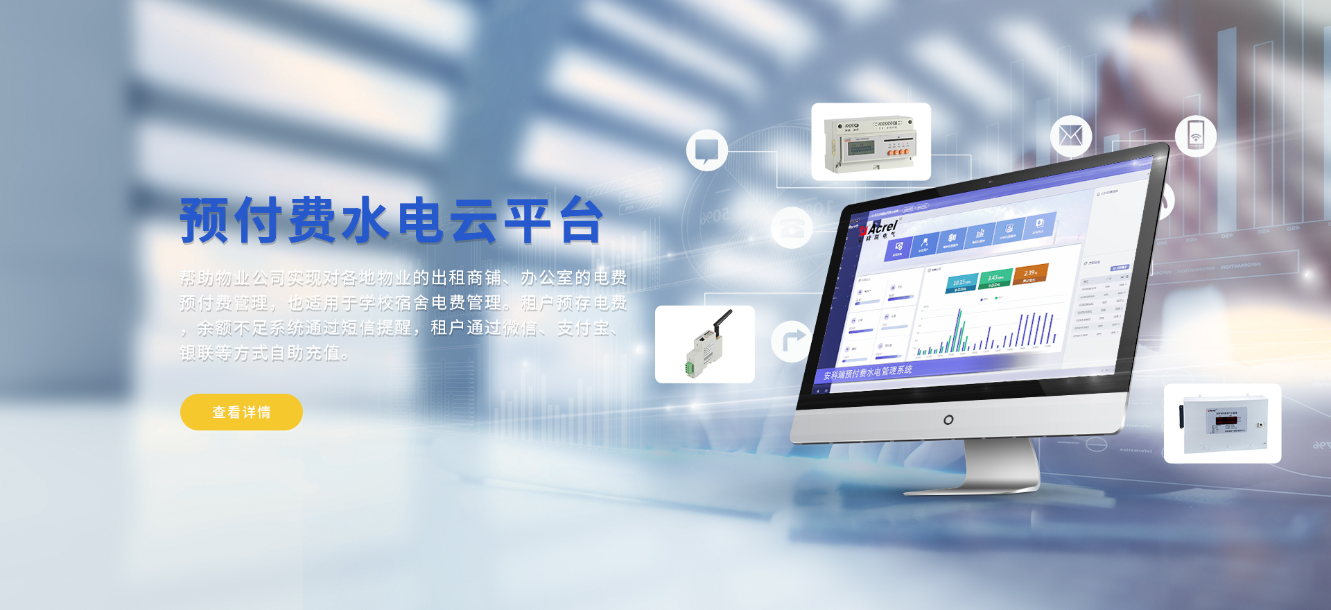 安科瑞提供的解決方案包括Acrel-EIoT能源物聯網云平臺、變電所運維云平臺、安全用電管理云平臺、環保用電監管云平臺、智慧消防云平臺能源管理云平臺、工業企業能源管控平臺、遠程預付費云平臺餐飲油煙監管云平臺、電動汽車/電瓶車充電樁收費管理云平臺、電力監控/無線測溫系統、電能質量治理系統、電氣火災監控系統消防設備電源監控系統、防火門監控系統、應急照明和疏散指示系統、智能照明控制系統、醫用隔離電源絕緣監測系統等,幫助用戶實現能源智能化、可視化、精細化管理,提高用能效率和用能安全,為企業節能降耗和實現能源數字化建設提供數據服務。